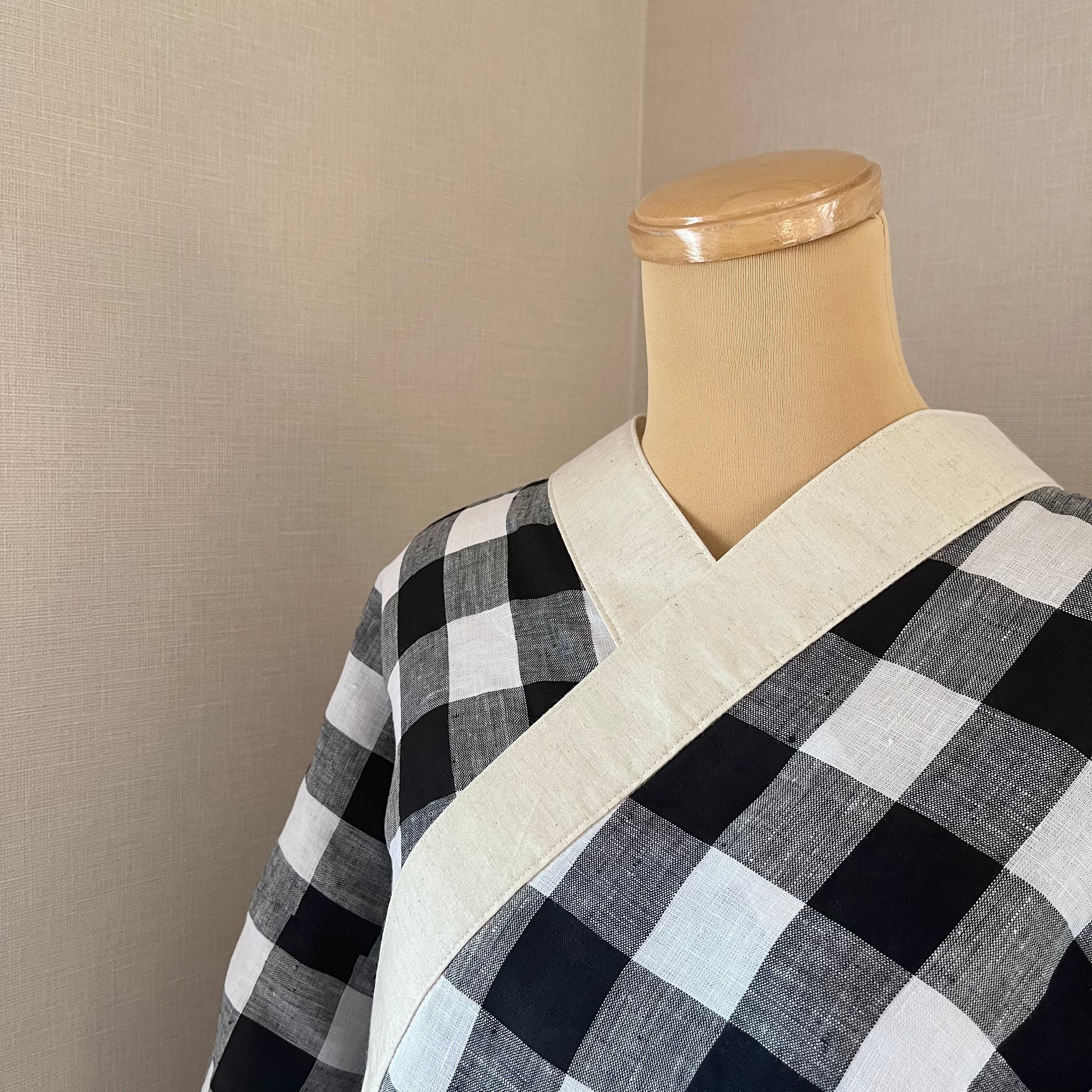 麻の筒袖半襦袢 白黒ギンガム